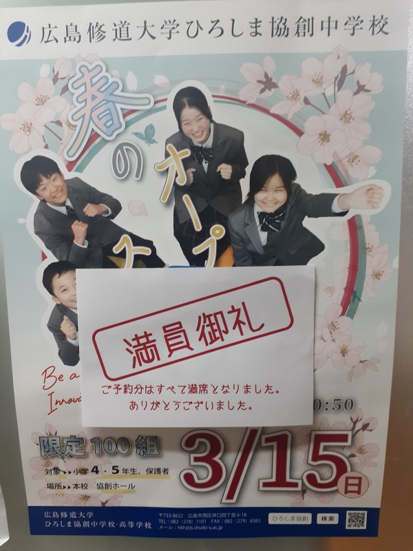 私たちもこういったイベントごとが新たにないか定期的に各学校さんのホームページをチェックするのですが、先日確認するとすでに定員の申し込みがあり締め切ったとの表示がされていましたので、「満員御礼」の札を貼らせていただきました。